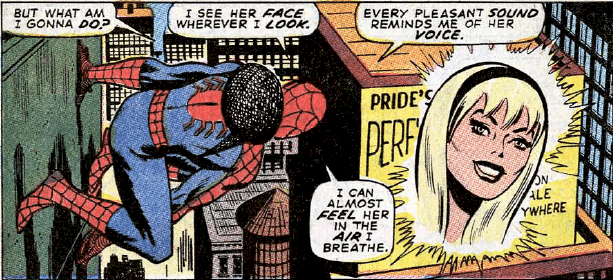 Visually, there are a few more parallels from perhaps a few more “deep cut” issues of the Lee era. The film opens with a shot of Mary Jane on a billboard advertising a brand of perfume, much like how Peter daydreams of Gwen on a perfume billboard in the opening pages of Amazing Spider-Man #95.