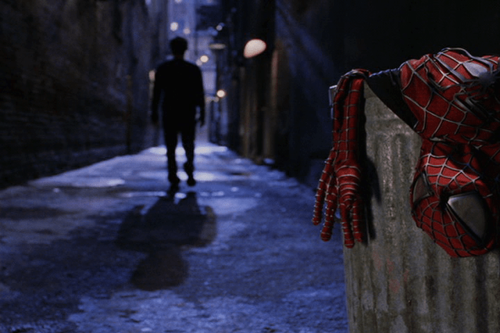 Better known by its title “Spider-Man No More!”, Amazing Spider-Man #50 delves into the mind of Peter Parker and gives us the kind of introspective story that elevated Marvel over its “Distinguished Competition” in the ’60s. The issue opens with a scene of Spider-Man stopping a payroll robbery, only to be met by fear instead of appreciation. Back at Empire State University, a brooding Peter gets news from Harry Osborn that his Aunt has fallen ill, and, as he always does, Peter chastises himself for spending too much time in the tights and not enough time with his surrogate-mother figure. This guilt causes his grades to slip, and as the issue goes we see more and more problems pile up on good ol’ Pete. This culminates to perhaps the most iconic scene in Spider-Man history (save one red-head’s introduction): Peter Parker, storming out of an alley in the pouring rain; in the foreground – the Spider-Man costume wadded in a garbage pail. It’s such a strong image that Raimi chose to reproduce it almost exactly.