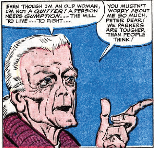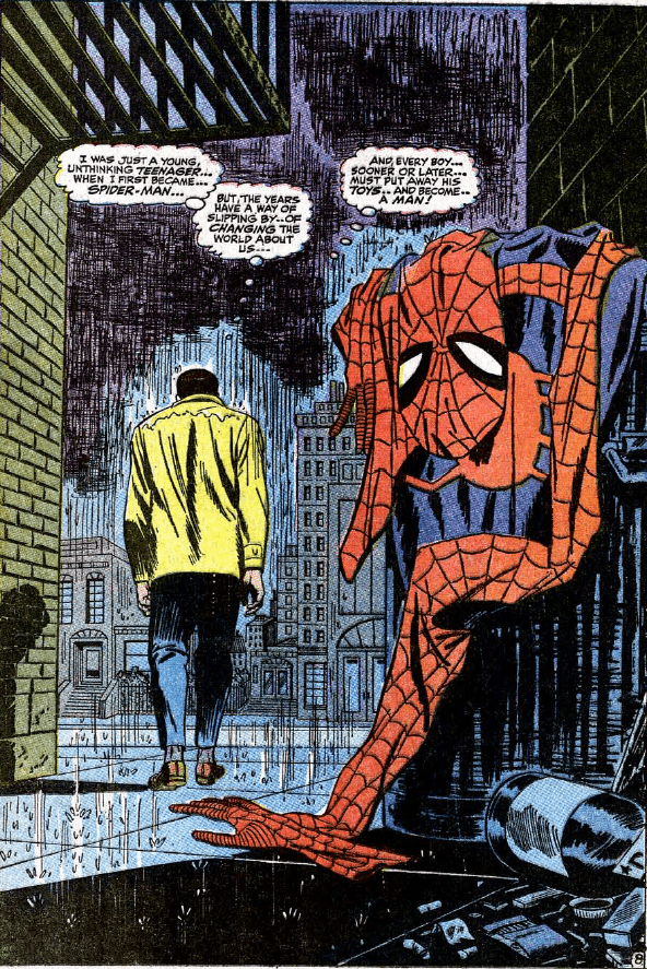 While Peter eventually comes to his senses after rescuing a night watchman who reminds him of Uncle Ben, in the film it is Aunt May that convinces Peter (indirectly) to return to his life of web swinging adventure, a beat borrowed from Amazing Spider-Man #18 (another story that addresses Peter being fed up with the responsibilities that come with being Spider-Man).