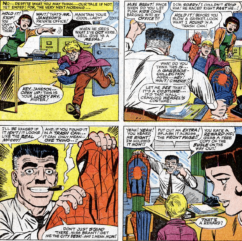 It isn’t long in both the comic and the film that someone discovers the discarded costume and brings it to an elated J. Jonah Jameson. In the comic, a child rushes into Jonah’s office while in the film it is a garbage collector (I always wondered why a seemingly well-off kid would be rooting around the garbage).