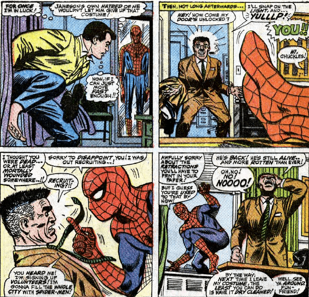 While the film allows JJJ a moment of redemption, realizing that perhaps Spider-Man WAS a hero (something the comics would not see until years later in Ultimate Spider-Man), the comic never gives us this. Instead, JJJ enters his office one morning only to find Spider-Man back in costume, legs kicked up on his desk.