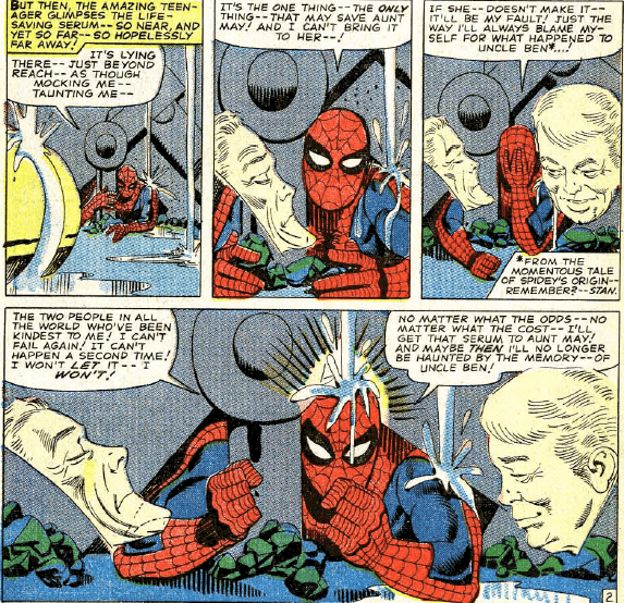 In the film, Peter likewise feels like he has too much responsibility in his life. As his doubt grows, his powers wane. He dreams of Uncle Ben, who again reminds him that “With great power comes great responsibility” (as the film puts it). Peter replies with a negative, saying that he is just going to be Peter Parker now. While Peter of Spider-Man 2 rebukes Spider-Man, Peter of Amazing Spider-Man #50 merely believes that it is more responsible for him to give up being Spider-Man. He says himself “in order to satisfy my craving for excitement – I’ve jeopardized everything that really matters– Aunt May – my friends – the girls in my life….”